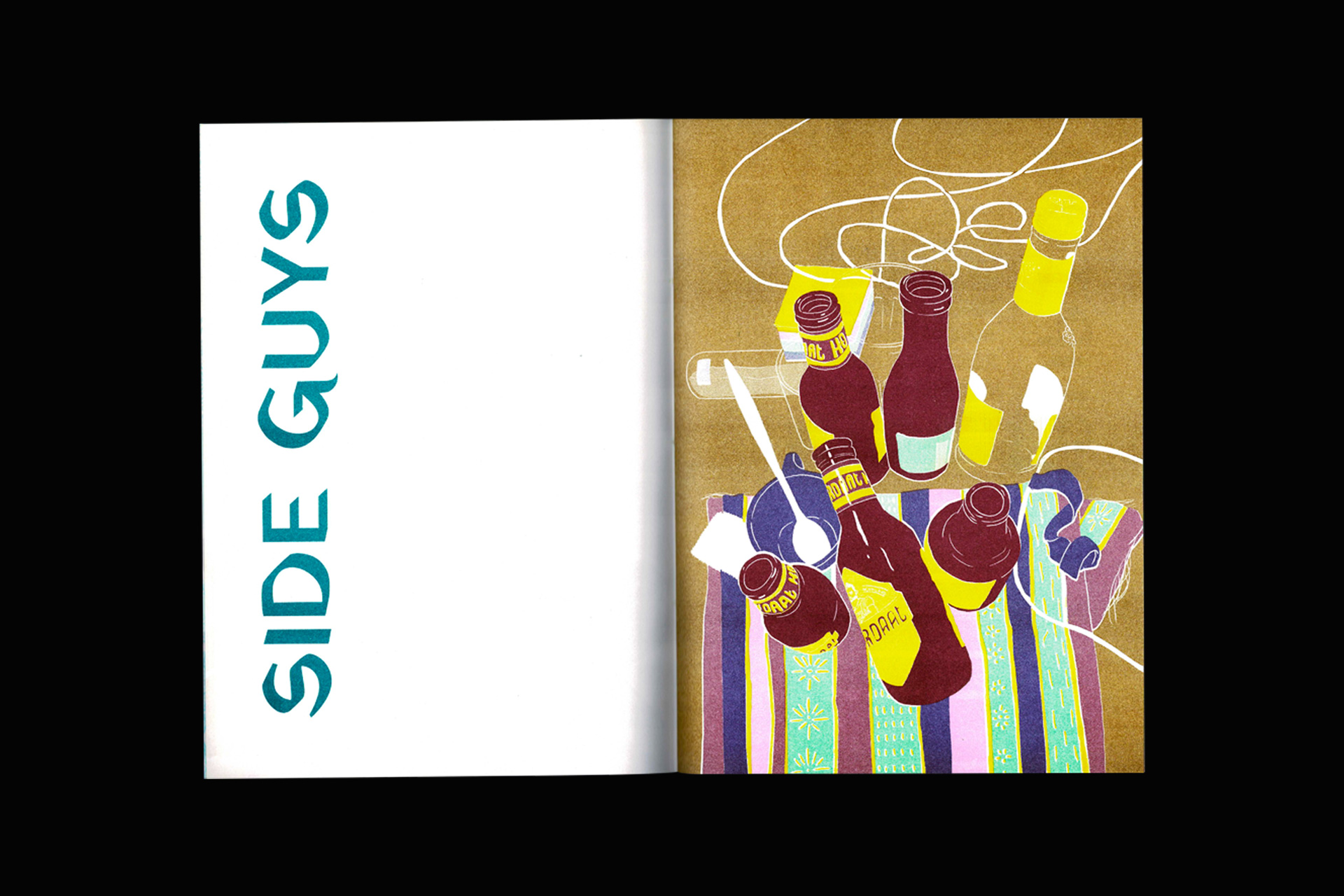 Side Guys es una recopilación de ilustraciones y textos cortos que indagan la relación entre conceptos como valor, ganancia, mérito y el amor romántico. En la era de la marca personal, donde una autopromoción constante de los logros personales es una necesidad para reforzar la idea de éxito frente a los demás, conseguir una pareja igual o más exitosa que uno se convierte en una meta que confirma las capacidades individuales en un mundo competitivo. Estas concepciones del mundo del emprendimiento, son comunes tanto en relaciones monogamas como poliamorosas, donde a pesar de los discursos, jerarquías existen y ciertas dinámicas son prevalentes
