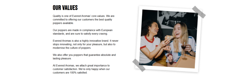 Screenshot of Everest aromas website stating the values of the company next to a pair of girls sharing a pizza with wine